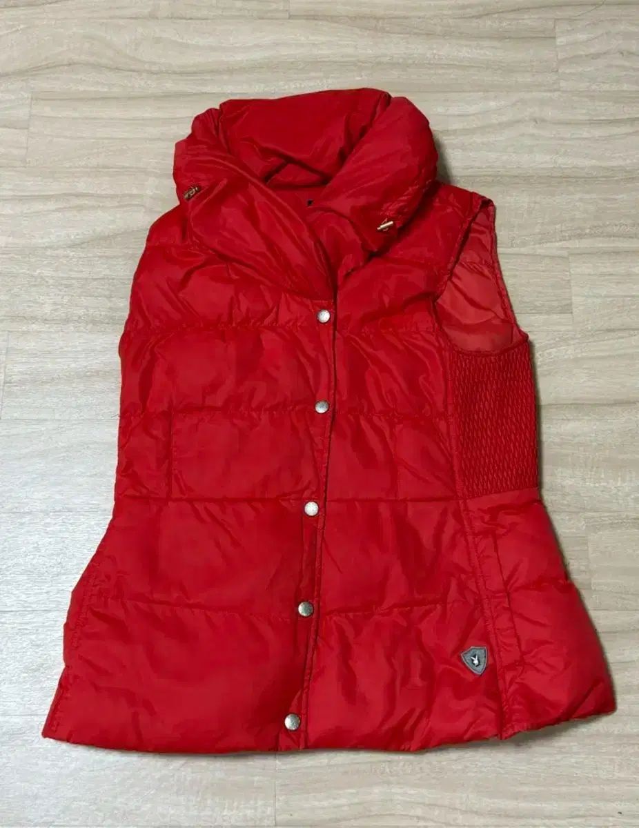 鮮やかな赤色のレディースゴルフウェア ダウンベストです。95サイズで、Mと表記されています。ネック部分が高く上がっており、保温性が良さそうです。コメントがなければ、すぐに安全決済してください!