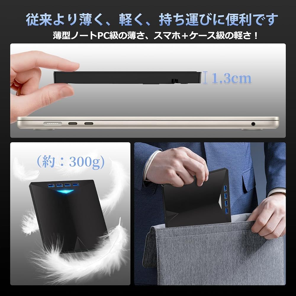 厚さわずか1.3cm、重さ約300gの超薄型・軽量設計。カバンに簡単に収まり、出張や旅行のお供としても最適です。