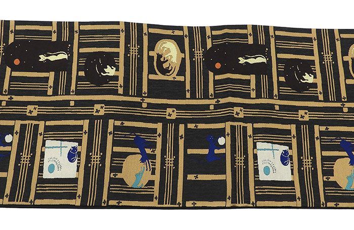 黒と茶鼠色の織り込み地に黄土色や紺色・オレンジ色などの多色で猫模様が柄付けされています。
