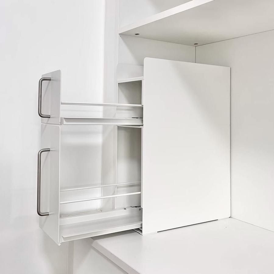 隠せる引き出し収納と上段棚の2つの収納で、生活感を隠しながらコンロ周りを整理整頓できます。