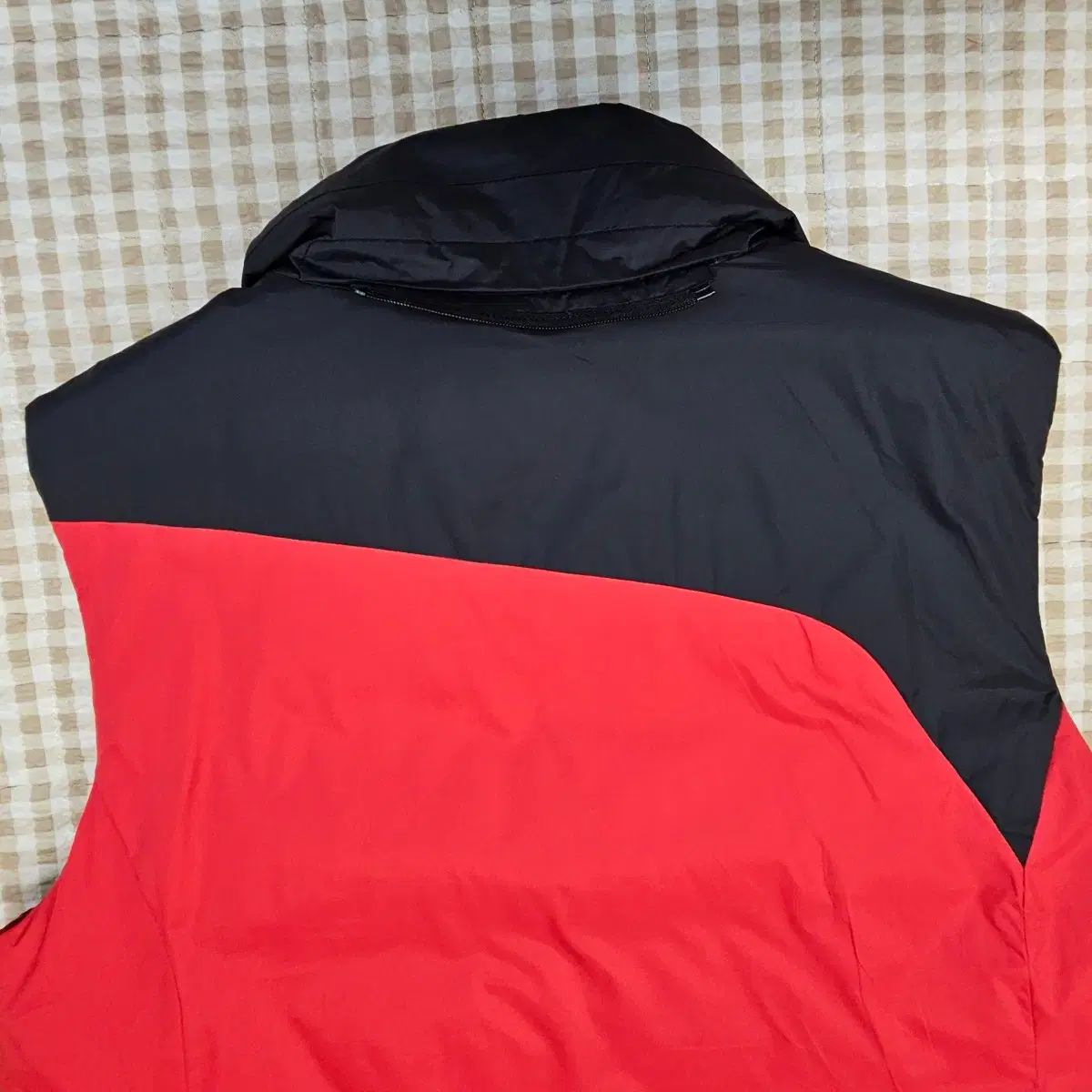 赤色のダウンベストです。中綿はダウンで、プレゼントでいただき2時間ほど着用後、自宅保管していたためコンディションはとても良いです。フードは取り外して紛失しました。