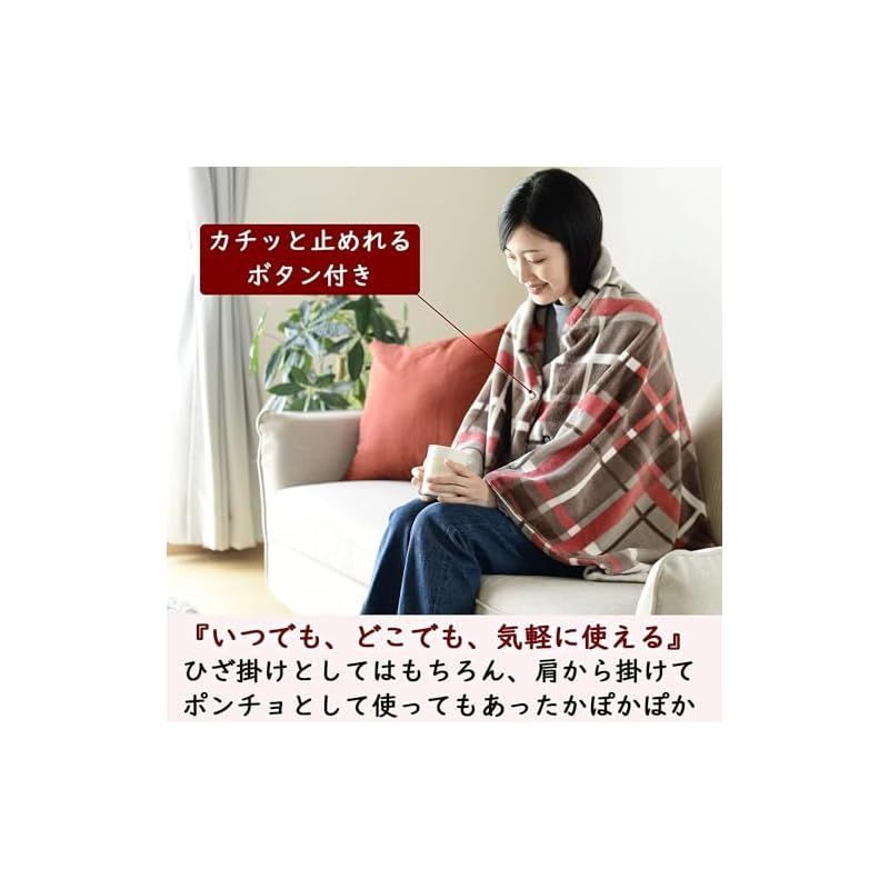 【2WAYで使える電気毛布】ひざに掛けたり包まれたりと使いやすいサイズの電気毛布。スナップボタン付きでポンチョにもなるので便利です。