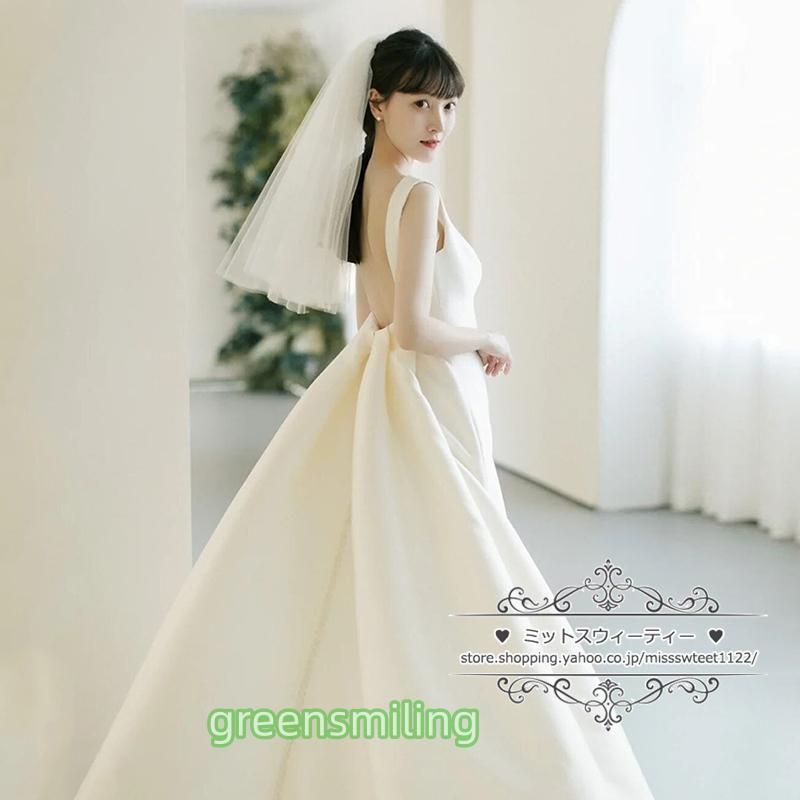 ウェディングドレス 二次会 結婚式 オフホワイト サテン Aライン バックレス 背中開き ブライダル ロングドレス 前撮り 挙式 花嫁