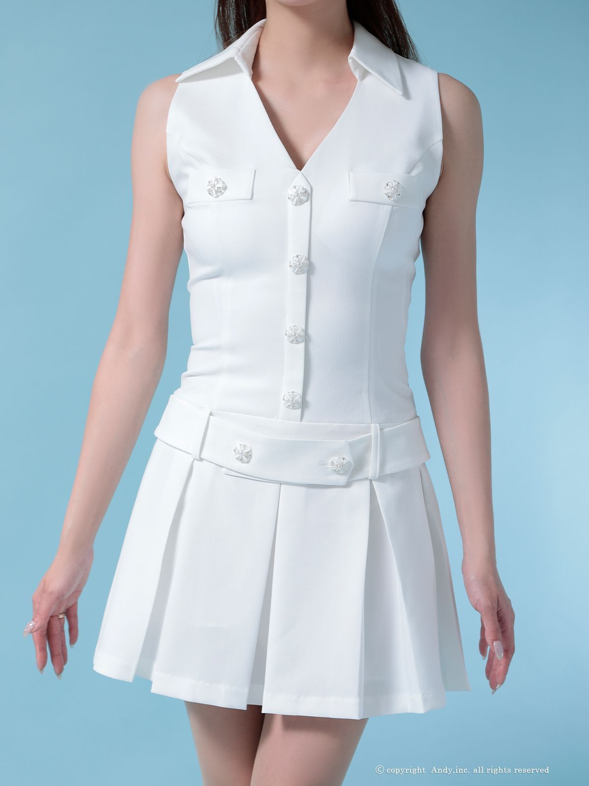 XSホワイト OF 05 OK 2960-BL-2507 ANDY アンディ ワン ビジューボタン 襟付き ノースリーブ Vネック ボックスプリーツ フ ミニドレス キャバドレス