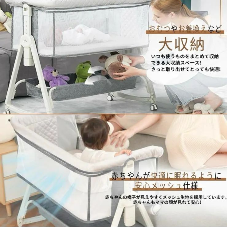 【高さ調節&ゆりかご機能】6段階の高さ調節が可能で、大人用ベッドにぴったり合わせて使用できます。寝たまま赤ちゃんを見守れるので便利!ゆりかご機能付きで、10度の優しい揺れが赤ちゃんを心地よい眠りへ誘います。三角形構造で安定性も抜群です。