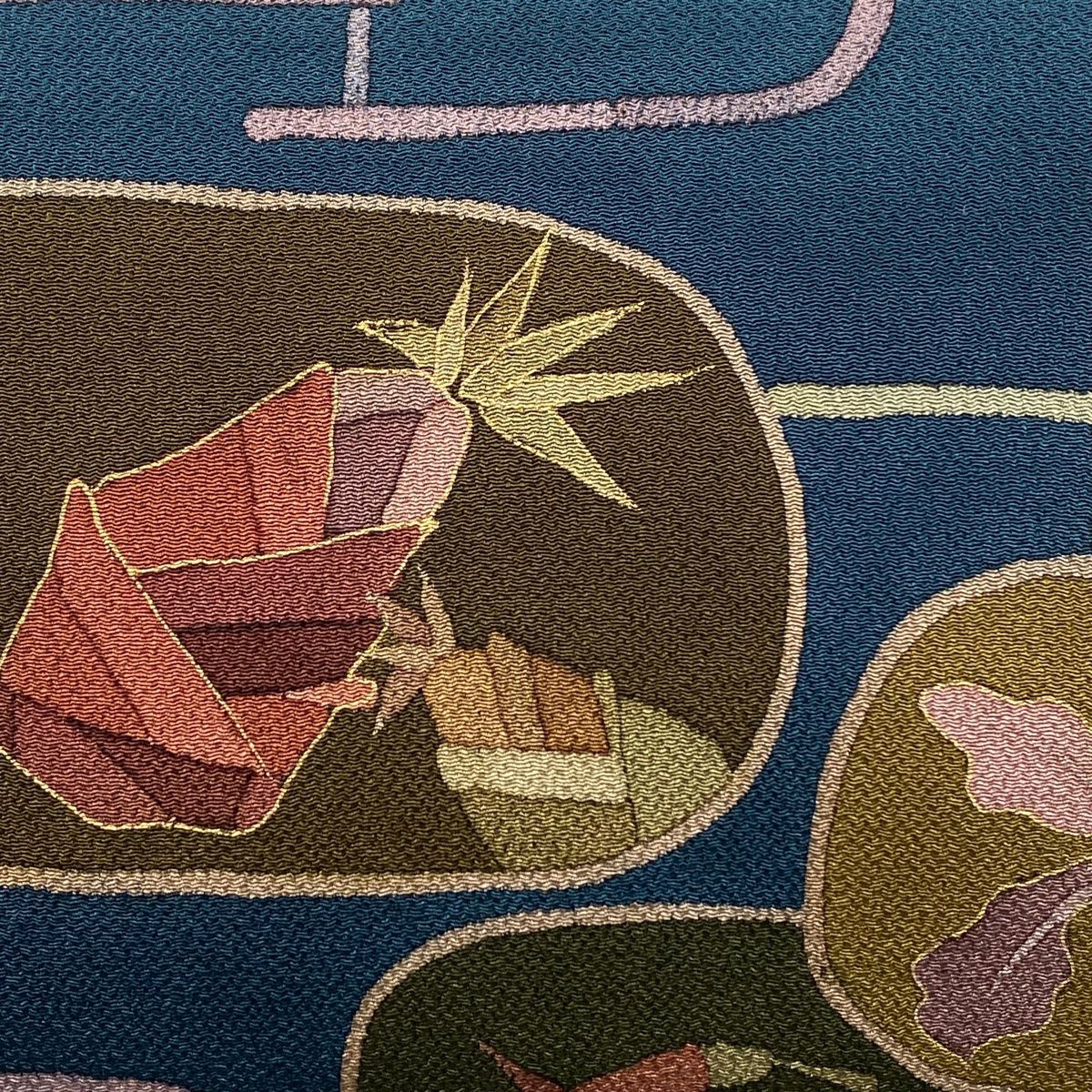 名古屋帯 秀品 野菜 幾何学 金彩 縮緬 青緑 正絹